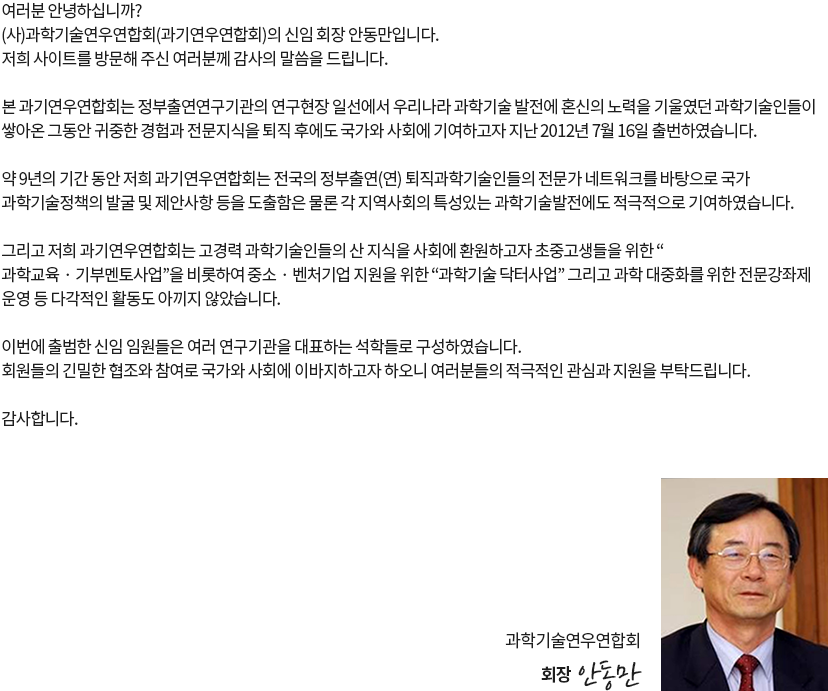 사단법인 고경력과학기술연우총연합회를 방문해주신 모든 여러분들께 감사의 말씀 드립니다.