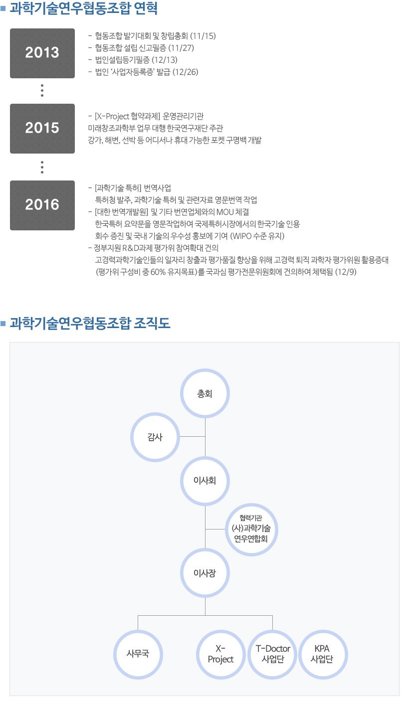 과학기술 연우협동조합의 연혁과 조직도입니다.